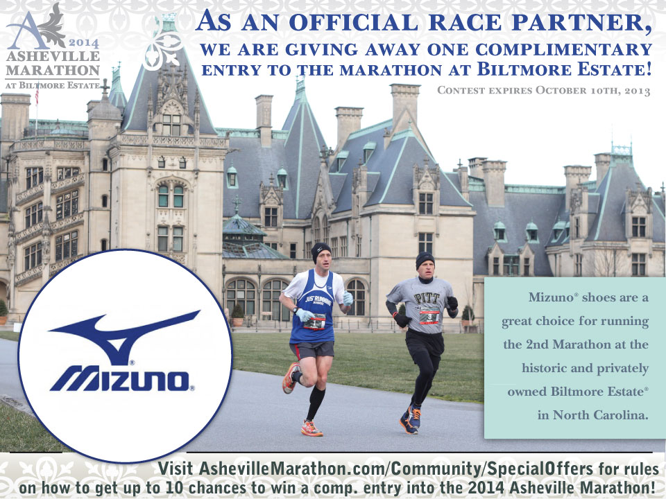 Now for a shameless plug. I’m applying for a contest, so forgive me. I wear Mission Wave Inspire 8s to train in. I love my emerald green shoes, to the point I’ve named them, Go’s (as in green means go). The company is a major sponsor of next year’s Ashville (N.C.) Marathon which goes through the famous Biltmore Estate. I’d love to run this race since it’s near my family. I plan to run it in Mizuno Wave Sayonoras or another pair of Inspires. A free race entry would make the trip a little easier on my family’s budget.