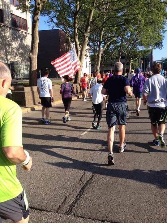 Then I saw HIM at my second half-marathon in Wheeling, W.Va. A Team RWB member lined up in the starting line pack near me. Once we got going, he passed me and I saw his flag. It was huge and on a wood-and-brass flag pole. Some of the runners cheered as he passed. I did too.