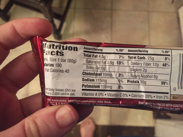 So I had the bar about an hour after the workout. It wasn’t like the sample I had at the grocery store. It looked a bit like a brick of taffy and kind of had the same chewiness as the candy. See the little cube in the bar? That’s the white fudge, the best part of the bar. I liked the cookies and cream and would probably get that flavor again.