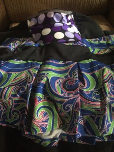 The Lioness skirt pictured here is in the Free Love fabric pattern. There are pockets on each short leg. My iPhone 6 fits these pockets. One pocket has a port with which your headphone cord can fit through.