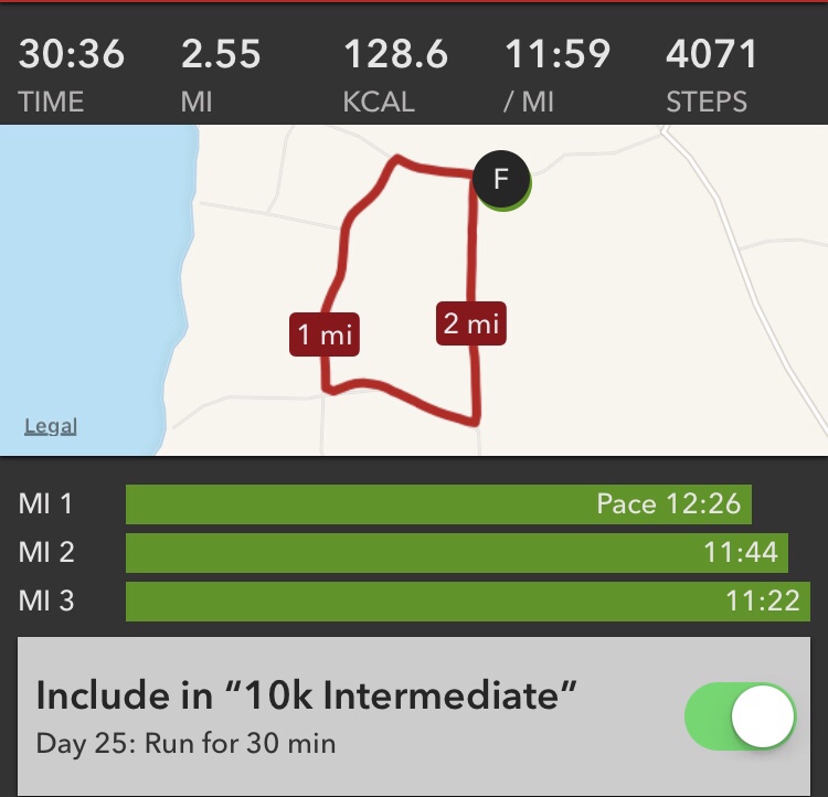 While it’s not in the range I need to be in by February (I hope to have solid 10-minute miles) it is encouraging. I think the last time my miles were timed, I was more in the upper 11-minute mile range. These were lower than before, and I felt comfortable.