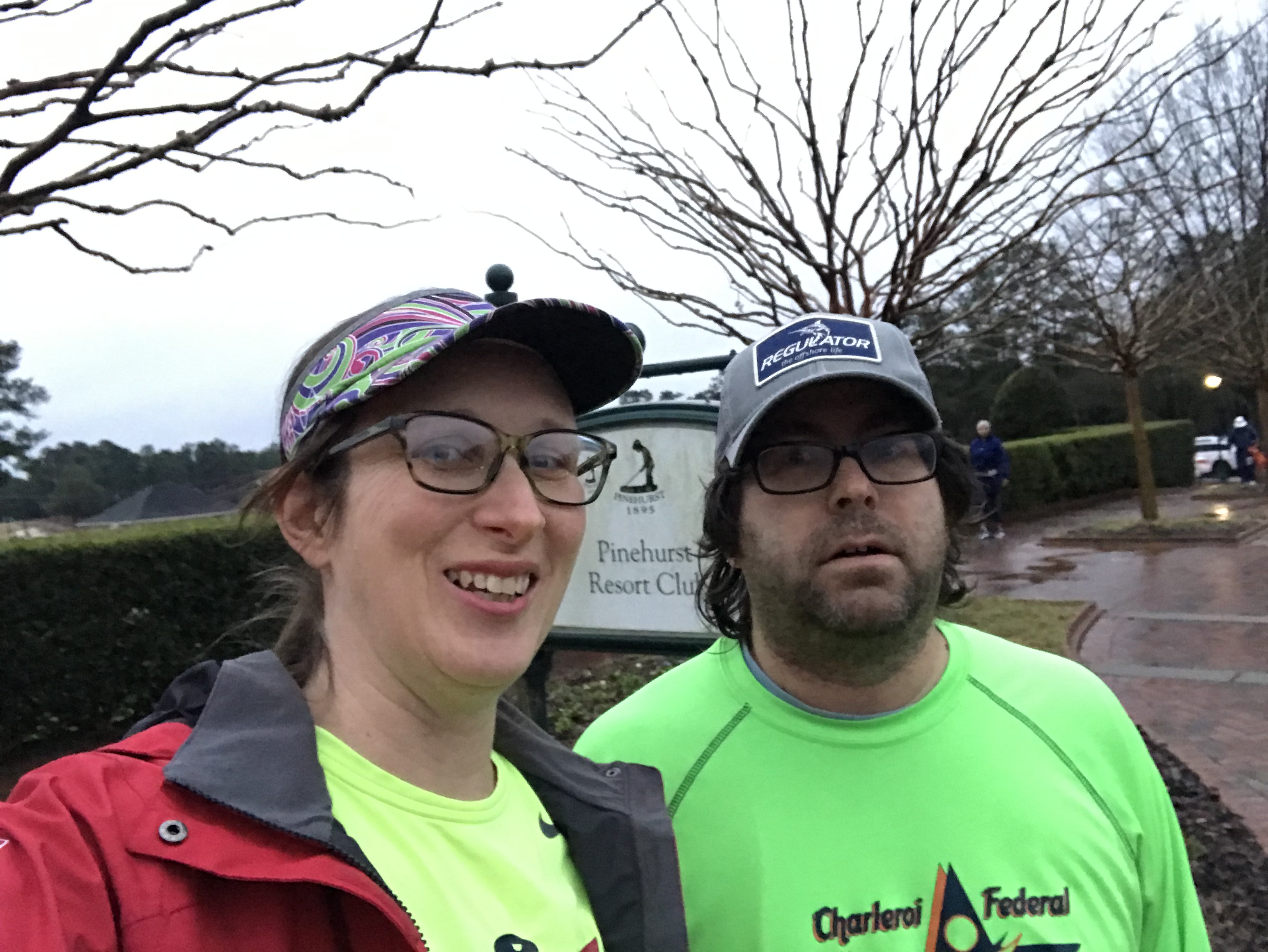 This race starts at the fabled Pinehurst Golf Course — where professional golfers become masters of their craft. It was rainy and chilly. If the weather called for a bit more rain, I probably would have blown off the race. Many people who signed up for the half marathon, dropped down to the 10K (6.2 miles) that morning.