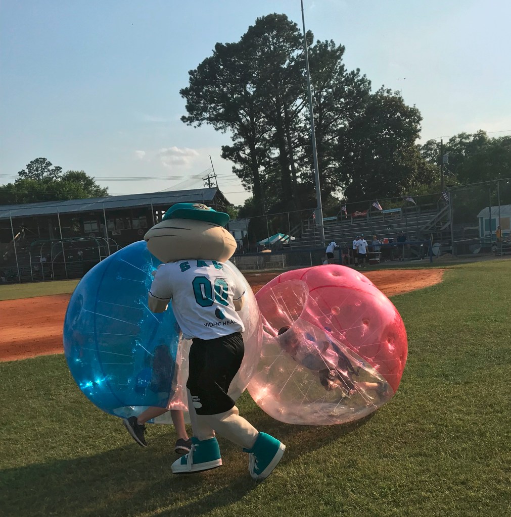 During Fan Fest, my sons ran into Sam the Clam, one of the Steamers’ mascot. Actually, Sam ran into Robert, who was trying out the knockerballs out with his brother, Joseph. After the fifth-grader fell on impact and rolled around in his inflatable ball, you could hear him laugh with delight.