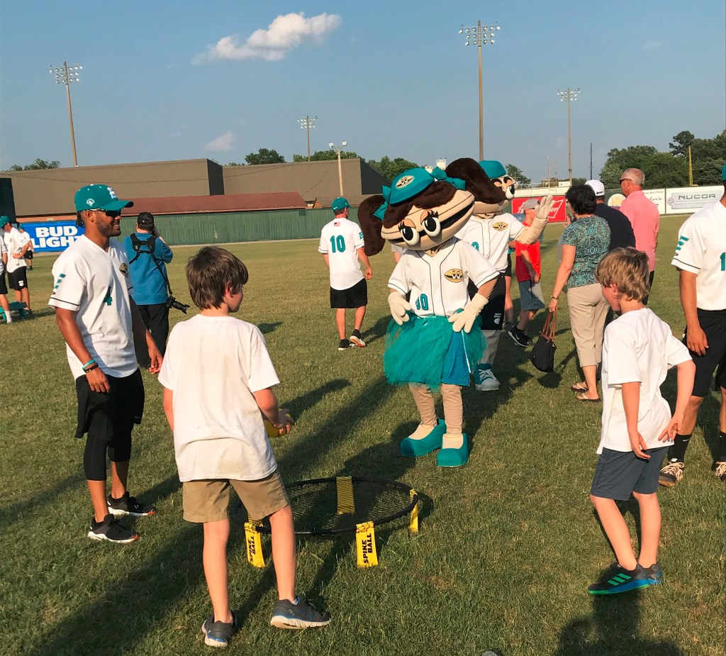 Pam, the female mascot, played spikeball with us and a few Steamers. The players were poised and friendly. My kids never played spikeball before, but the players were patient and kind as we attempted to play. They cheered everyone on when the game went well. It was nice to see my kids connect with someone.