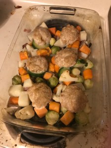 The bag give you a recommended way of roasting the vegetables. I mixed the red potatoes, onion, carrot and zucchini blend with the halved brussel sprouts, sweet potatoes and onions, taking out the onions.