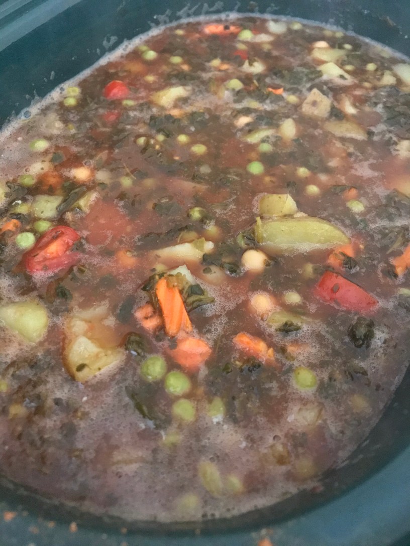 One of the things we make during cold weather is Kitchen Sink Soup. It’s a good way to use odds and ends in your cabinet at fridge. I usually cook this in the crockpot while I’m at work as it develops flavors more. My husband just cooks it on the stove.
