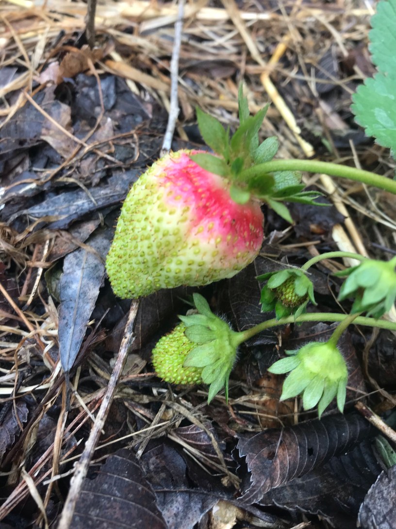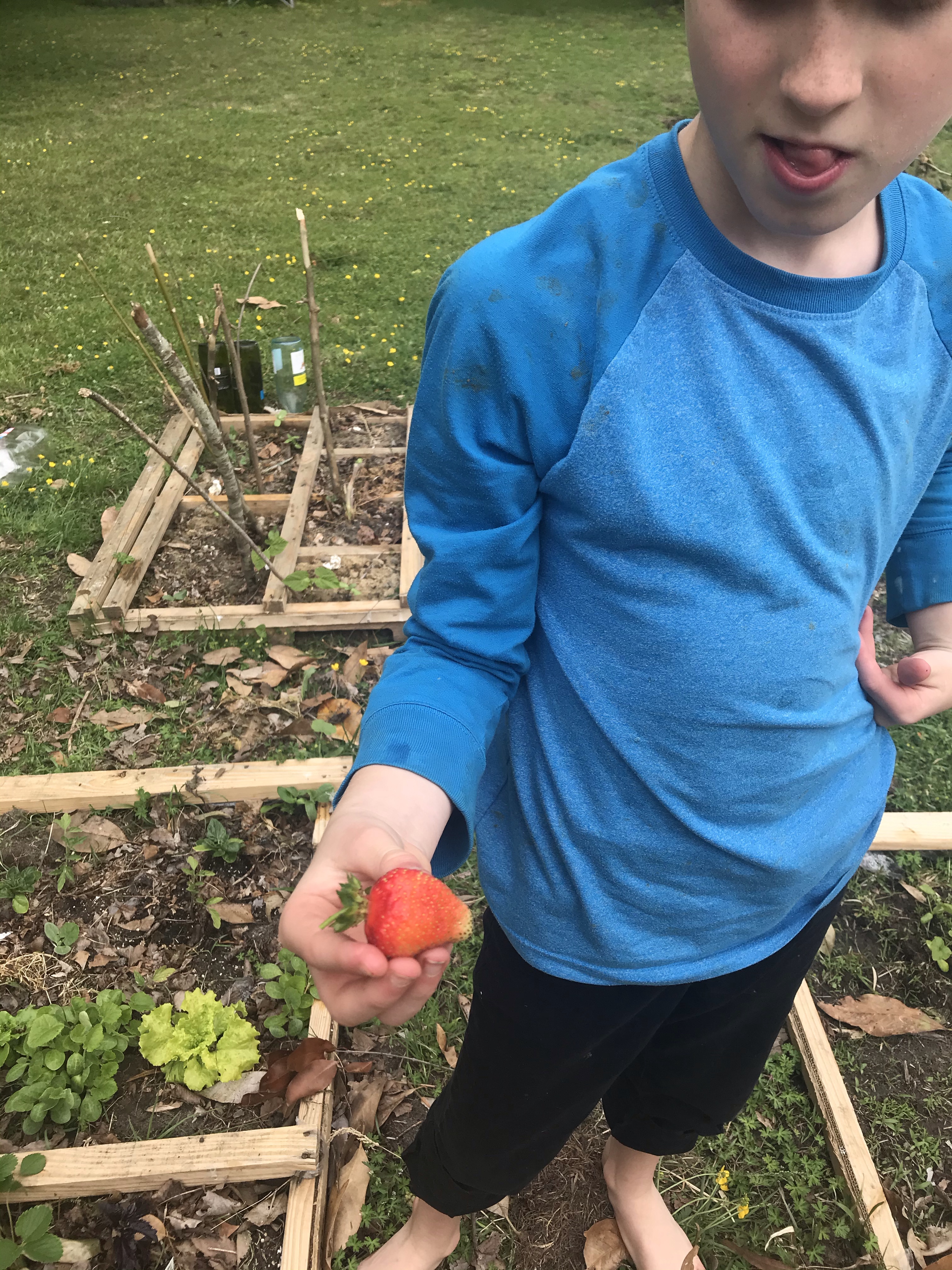 A few strawberries were turning pink the week we started documenting the garden. My youngest son says they are sour but good. Nothing like a juicy, homegrown food.
