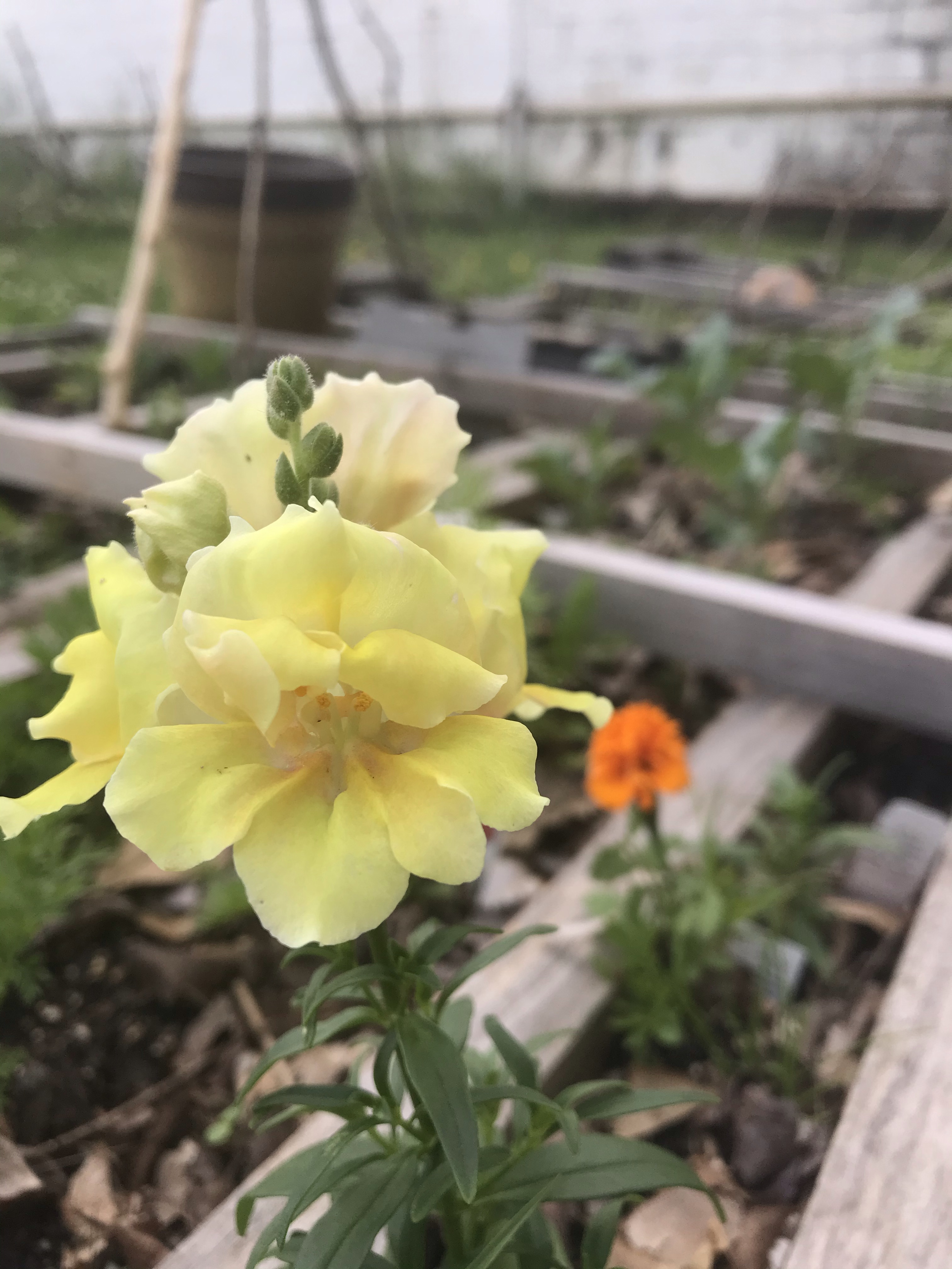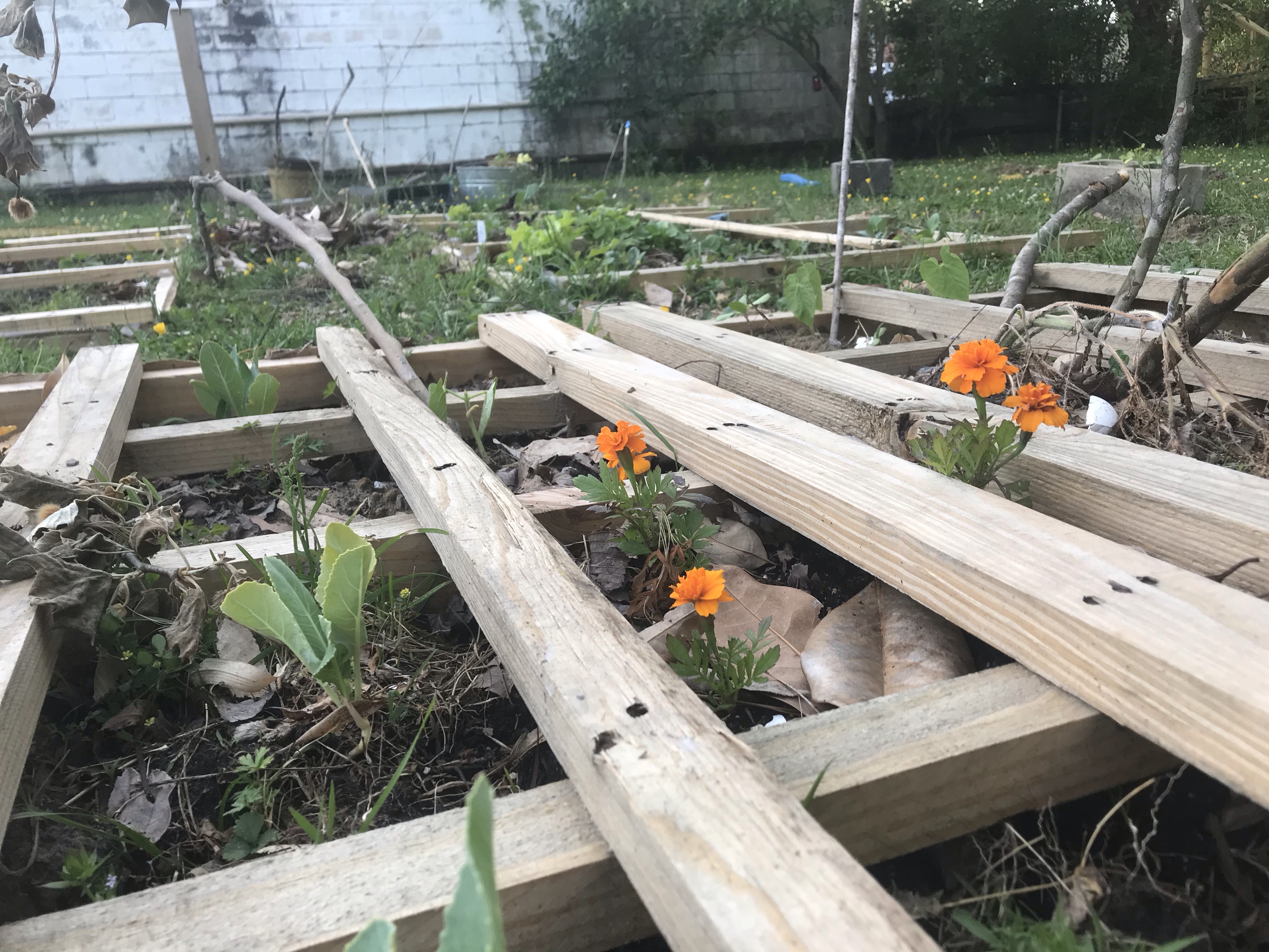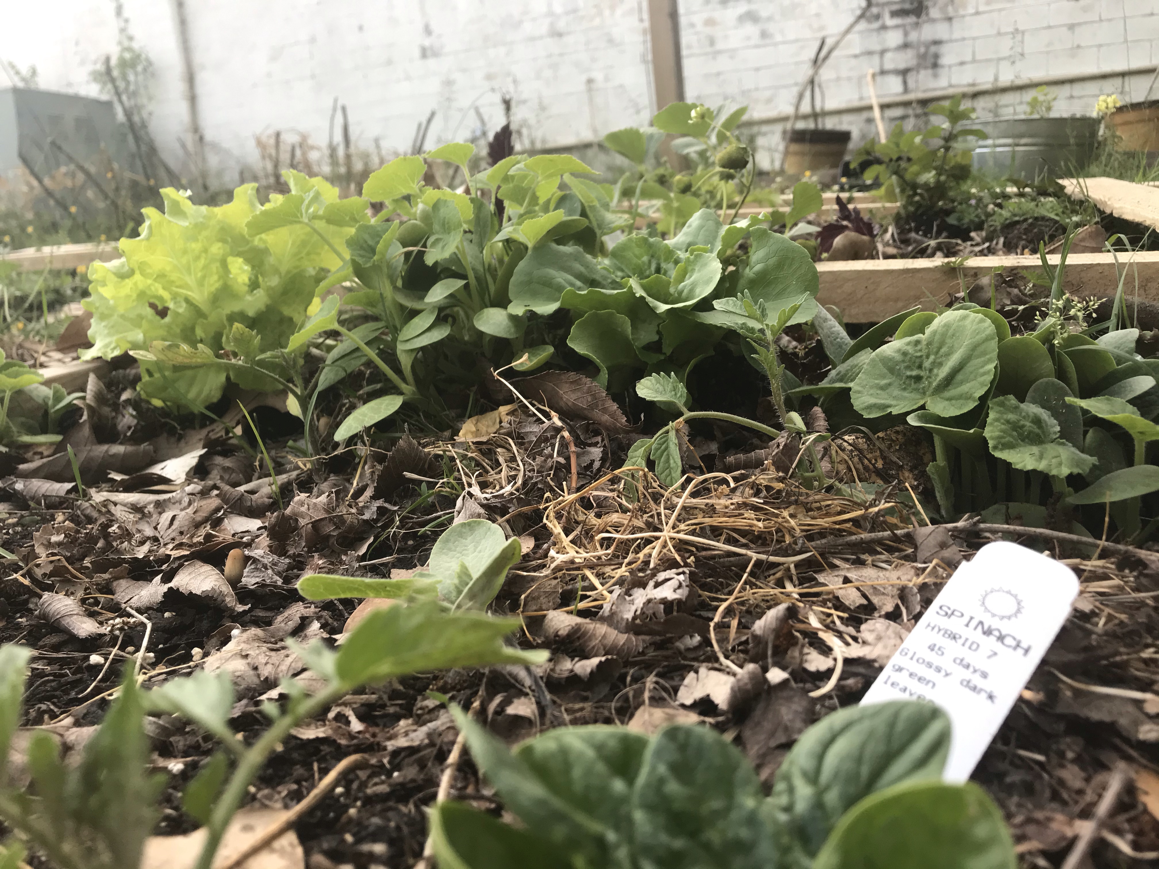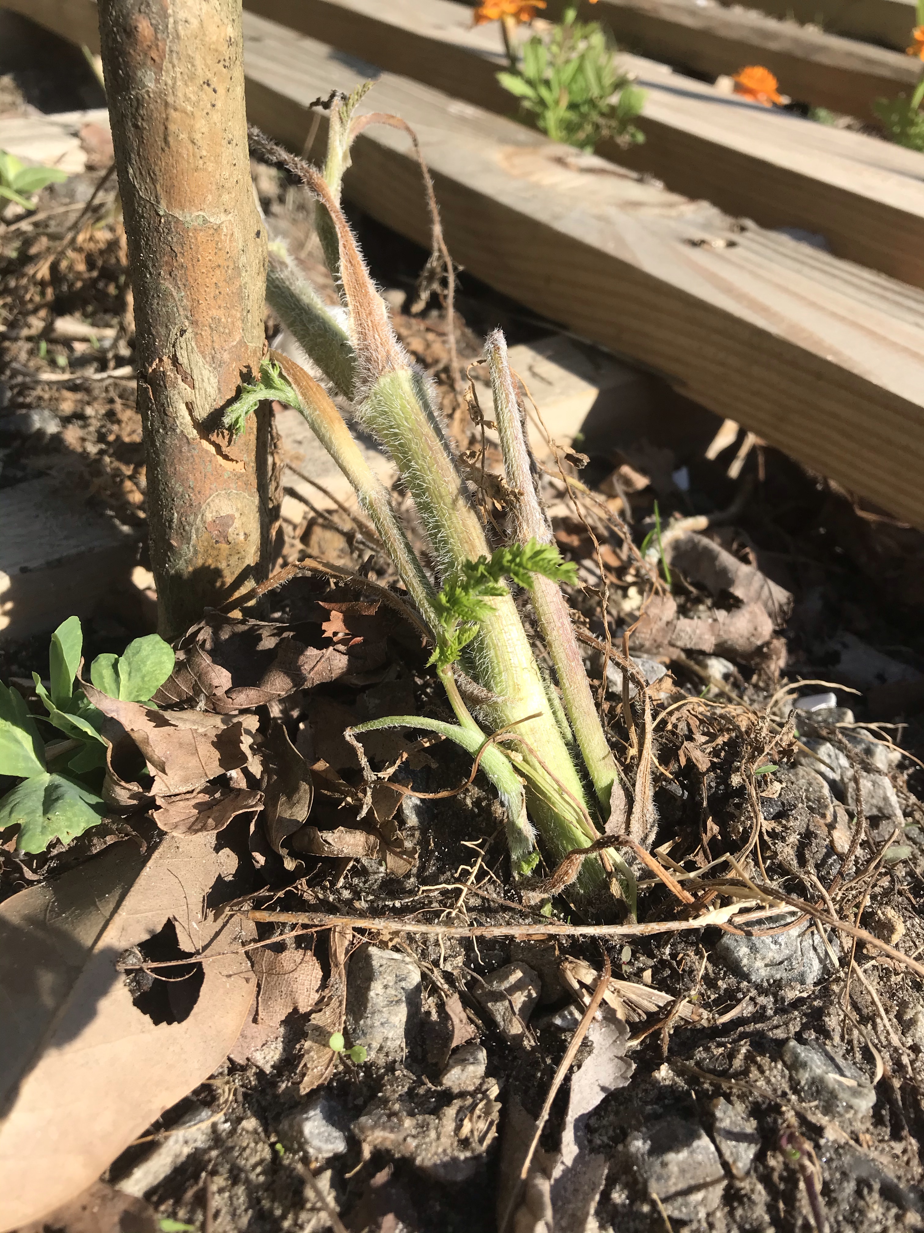 The plants survived everything. Some of our posts and sticks we set up for the pea shoots got knocked out of the ground or were slanted. But it’s all good.