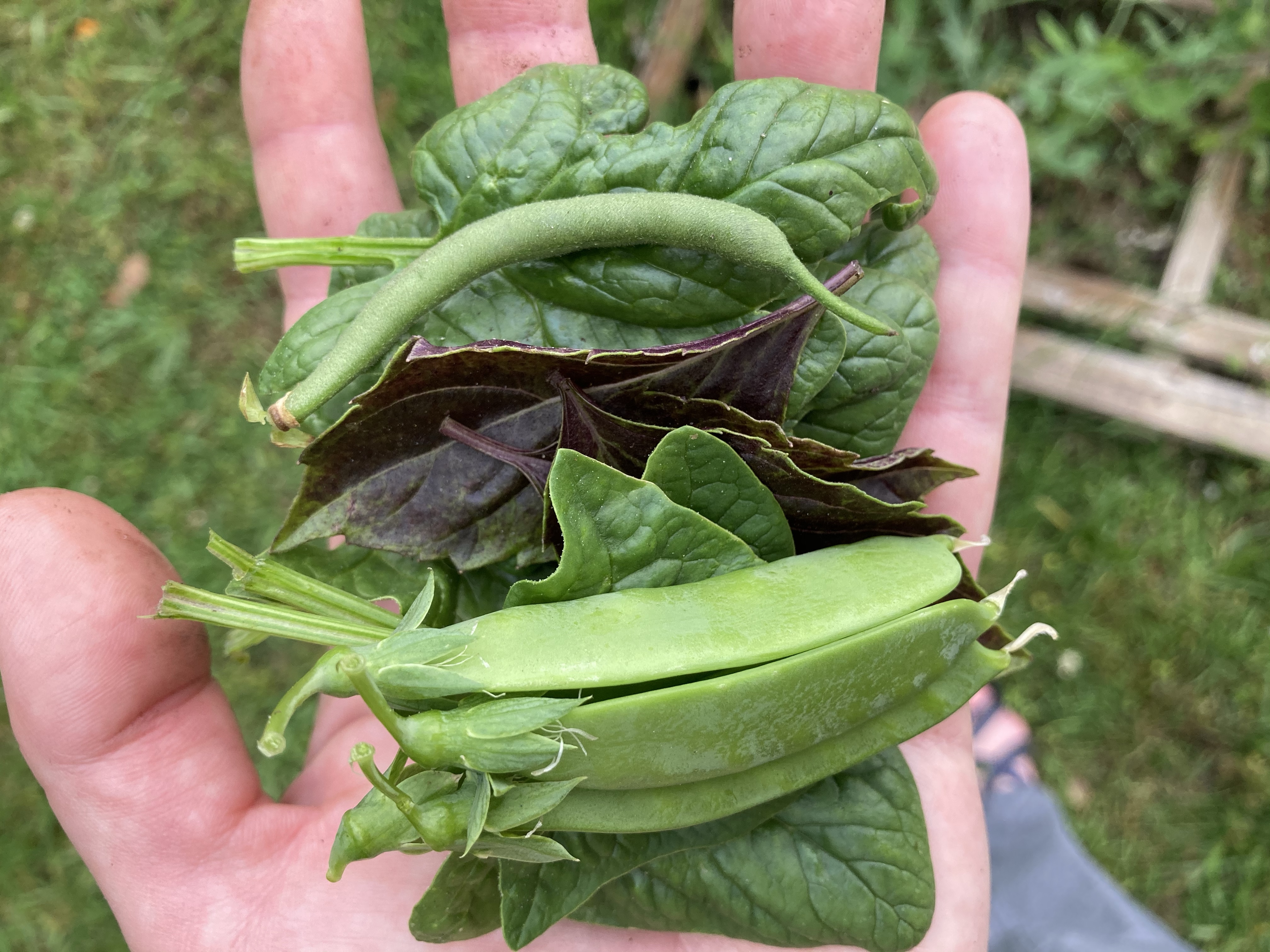 A harvest of spinach, basil (purple), snow peas and beans.