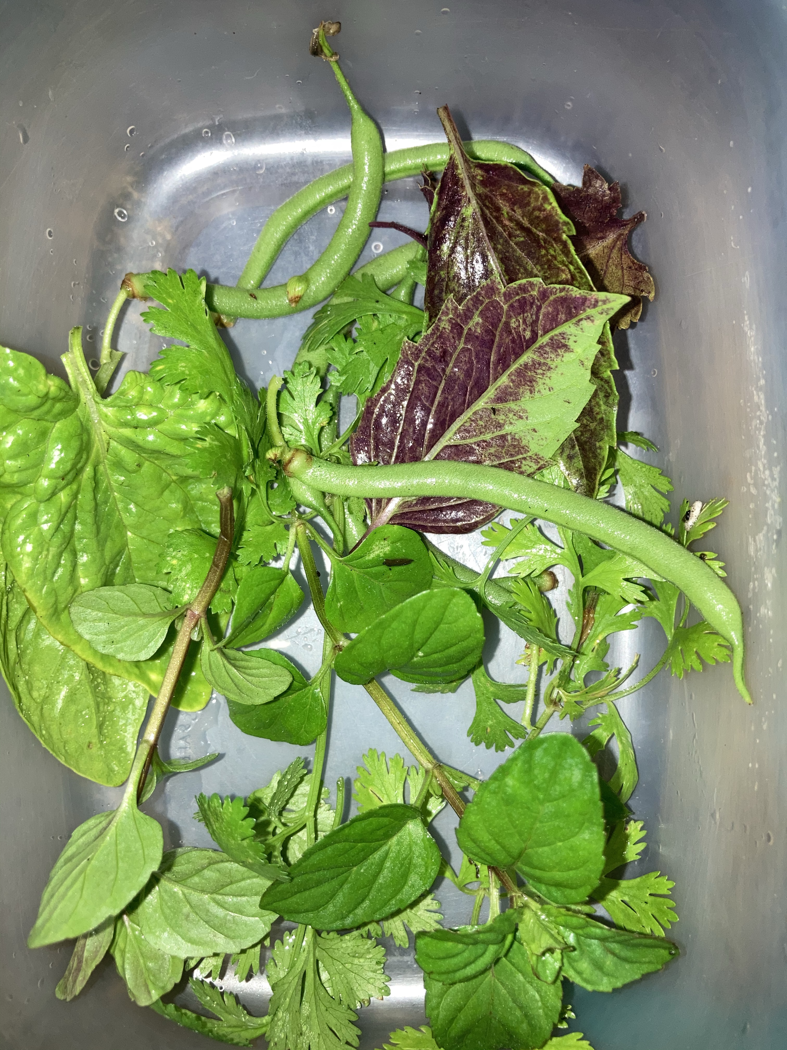 Harvest of spinach, mint, beans and cilantro.