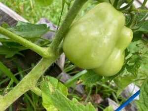 We have three kinds of tomatoes in the garden — yellow cherry tomatoes, Roma tomatoes and big ones whose name escapes me at the moment.