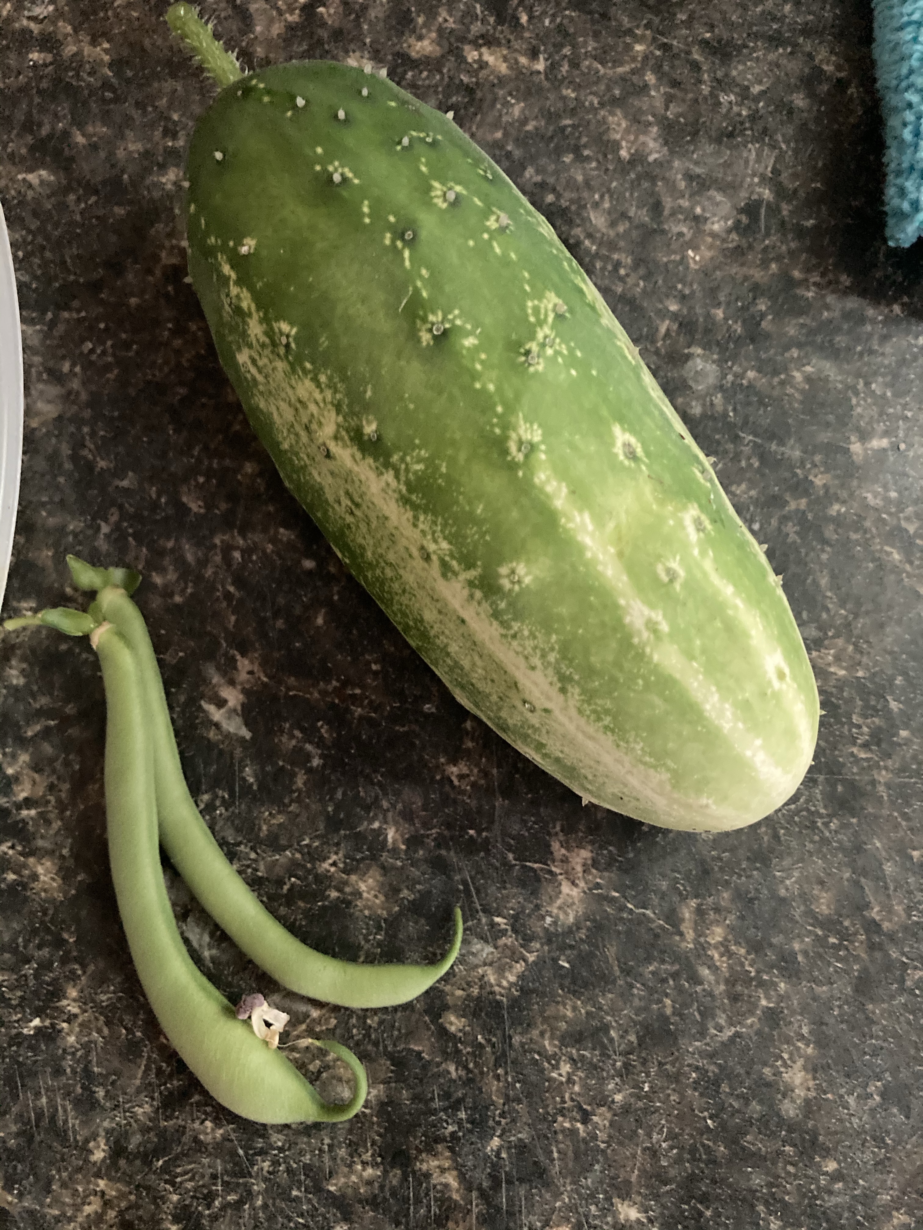 Another harvest of beans and our first cucumber