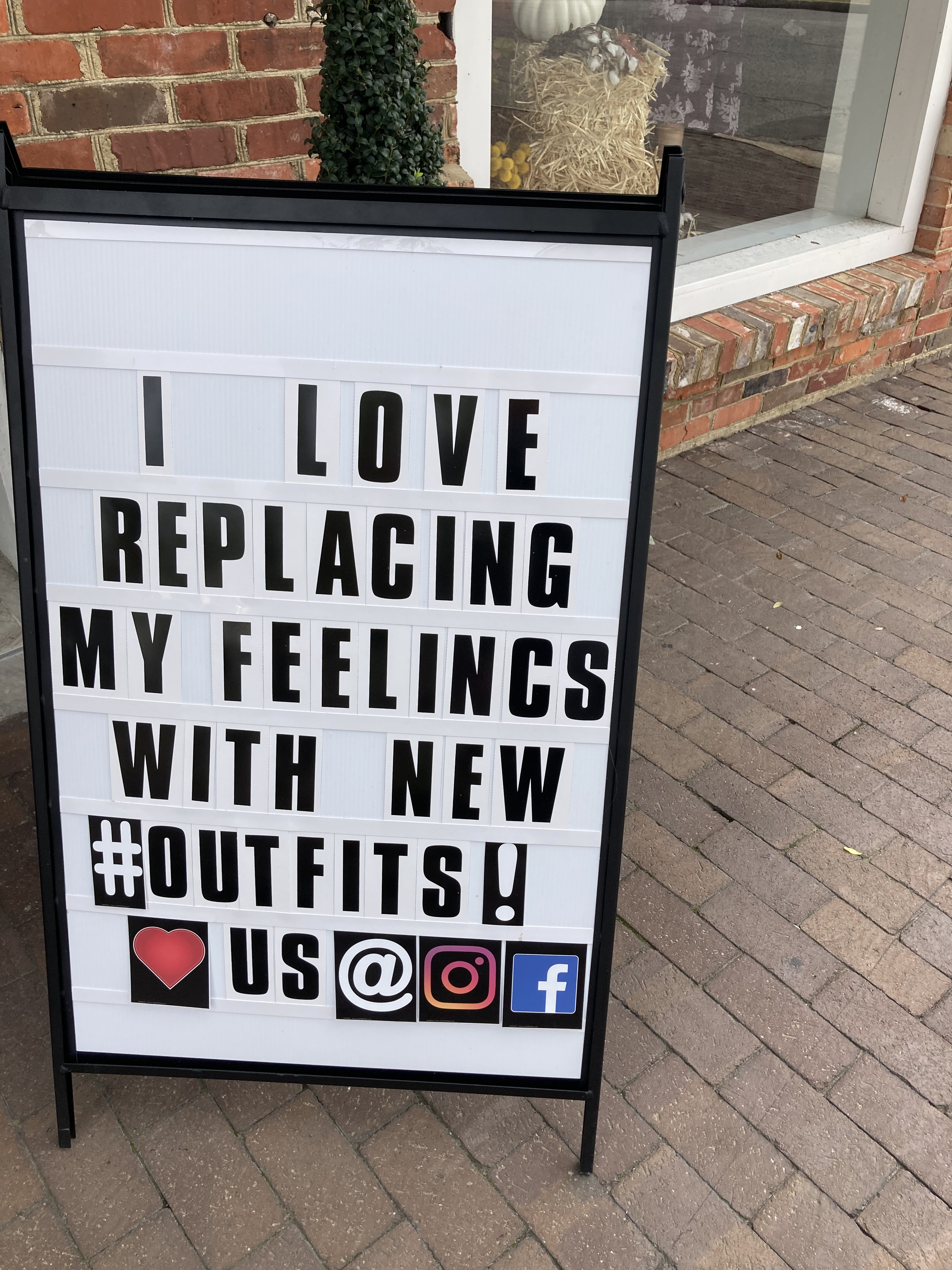 The sign reads, “I love replacing my feeling with new #outfits!” and then goes on to list various social media.