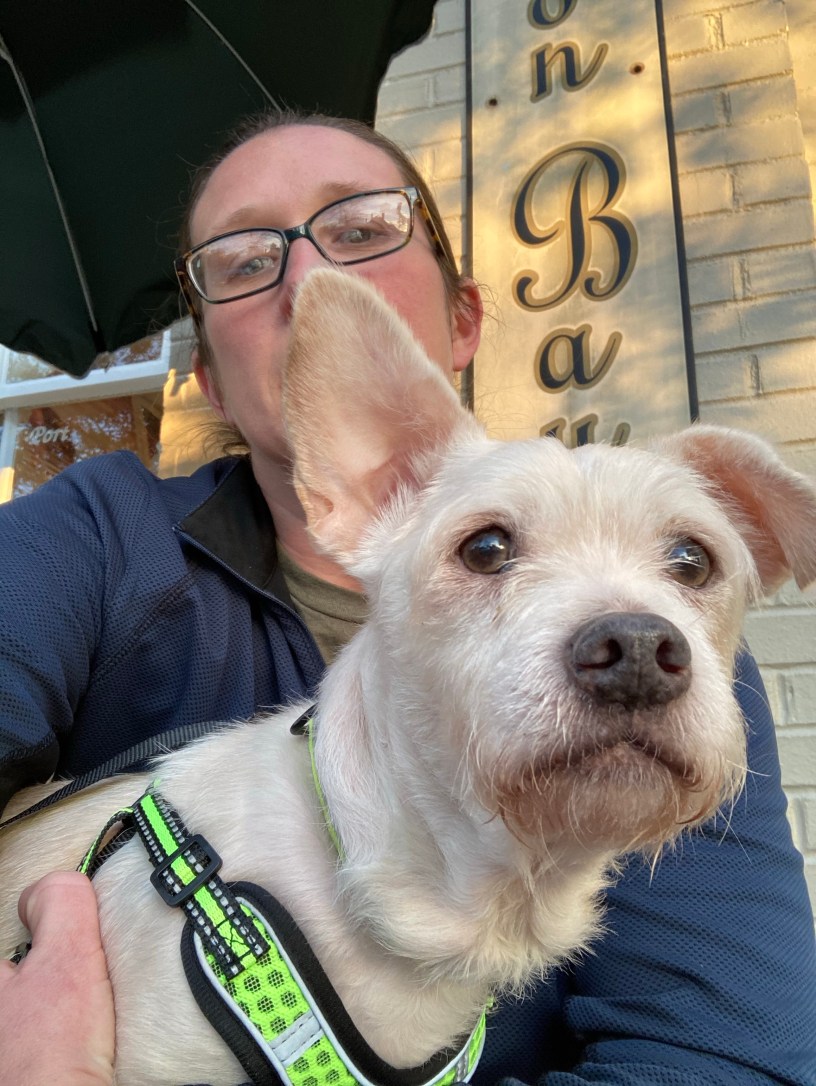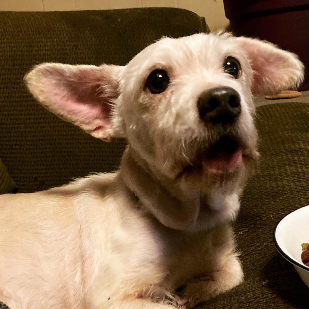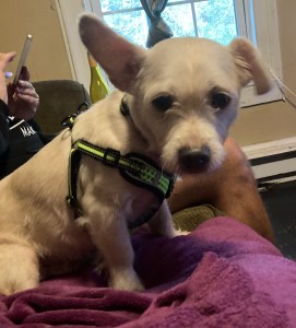 Scottie sounds like a terrier but has one dachshund ear, which folds down, and one really long one that stands up. It makes him look a bit like Yoda, a character from my family’s favorite sci-if series, Star Wars.