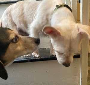 Since Dad was not convinced Scottie and Blue would get along, the shelter director told us to foster Scottie for a few weeks and see how things work out. Scottie is the name the shelter staff gave him, as the previous owner’s son didn’t tell them his name.