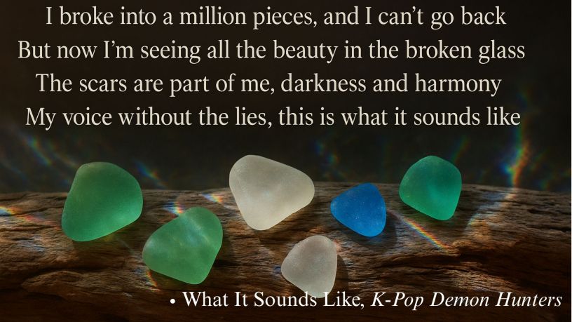 What It Sounds Like reminds me of my collection of sea glass. At one point, they were parts of bottles, bowls, plates — things in someone’s home to admire or store other items. That jagged, broken glass that was weathered by the elements is more beautiful than before. The glass become a prism of sorts, making the light extra special. That light is reflected in your true self, flaws and all.